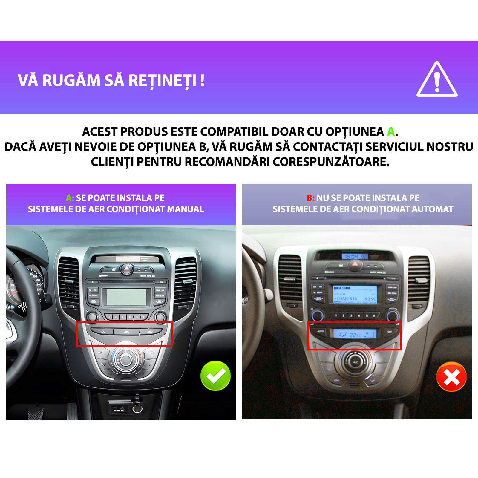 • Desi aceste sisteme sunt concepute pentru instalare de tip „Plug & Play”, in cazuri exceptionale, particularitatile specifice fiecarui model auto pot impune o atentie suplimentara in ceea ce priveste conectica si integrarea cu sistemele originale ale vehicululu . ( Daca este cazul, anumite atentionari vor fi evidentiate in imaginile produsului.)