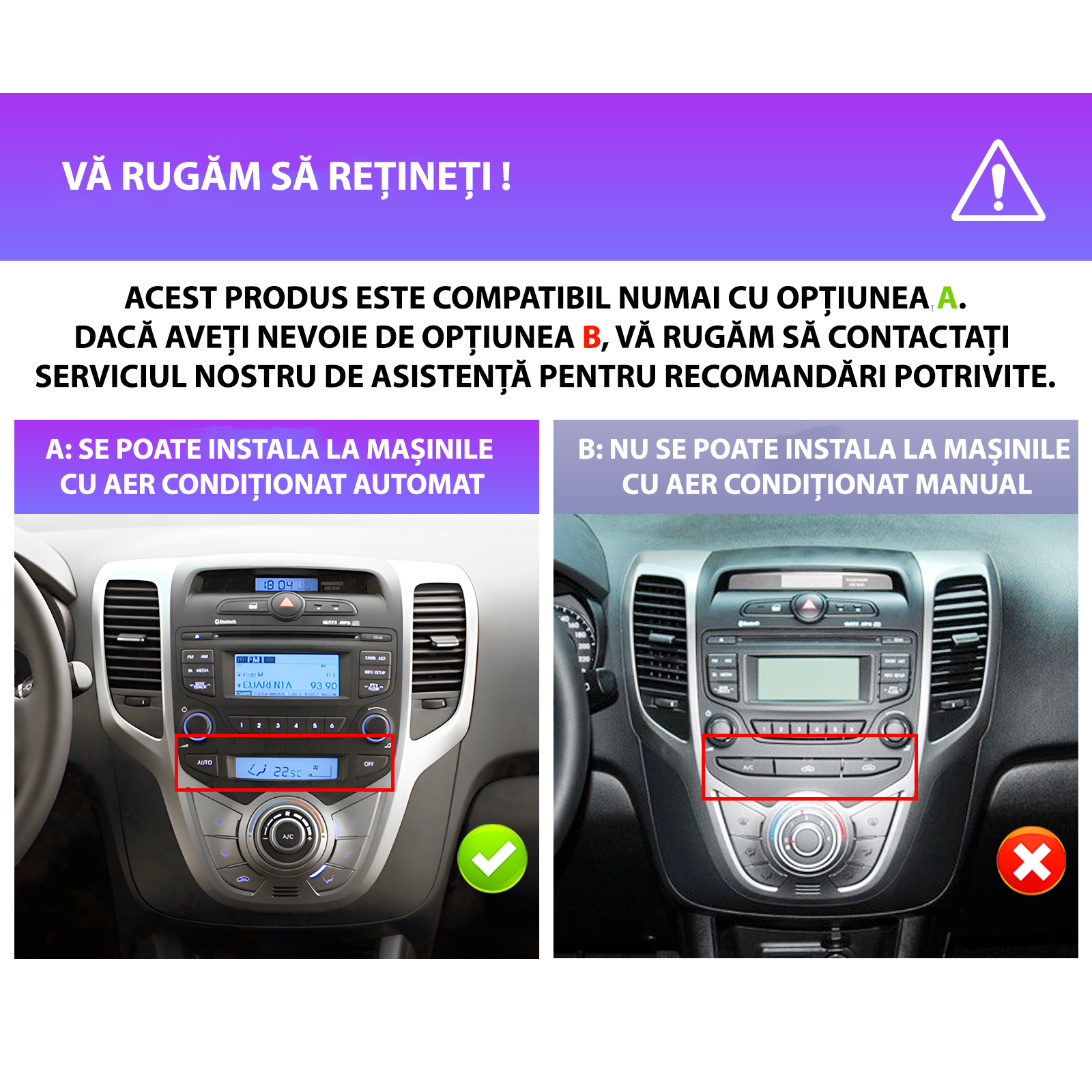 - Desi aceste sisteme sunt concepute pentru instalare de tip „Plug & Play”, in cazuri exceptionale, particularitatile specifice fiecarui model auto pot impune o atentie suplimentara in ceea ce priveste conectica si integrarea cu sistemele originale ale vehicululu . ( Daca este cazul, anumite atentionari vor fi evidentiate in imaginile produsului.)