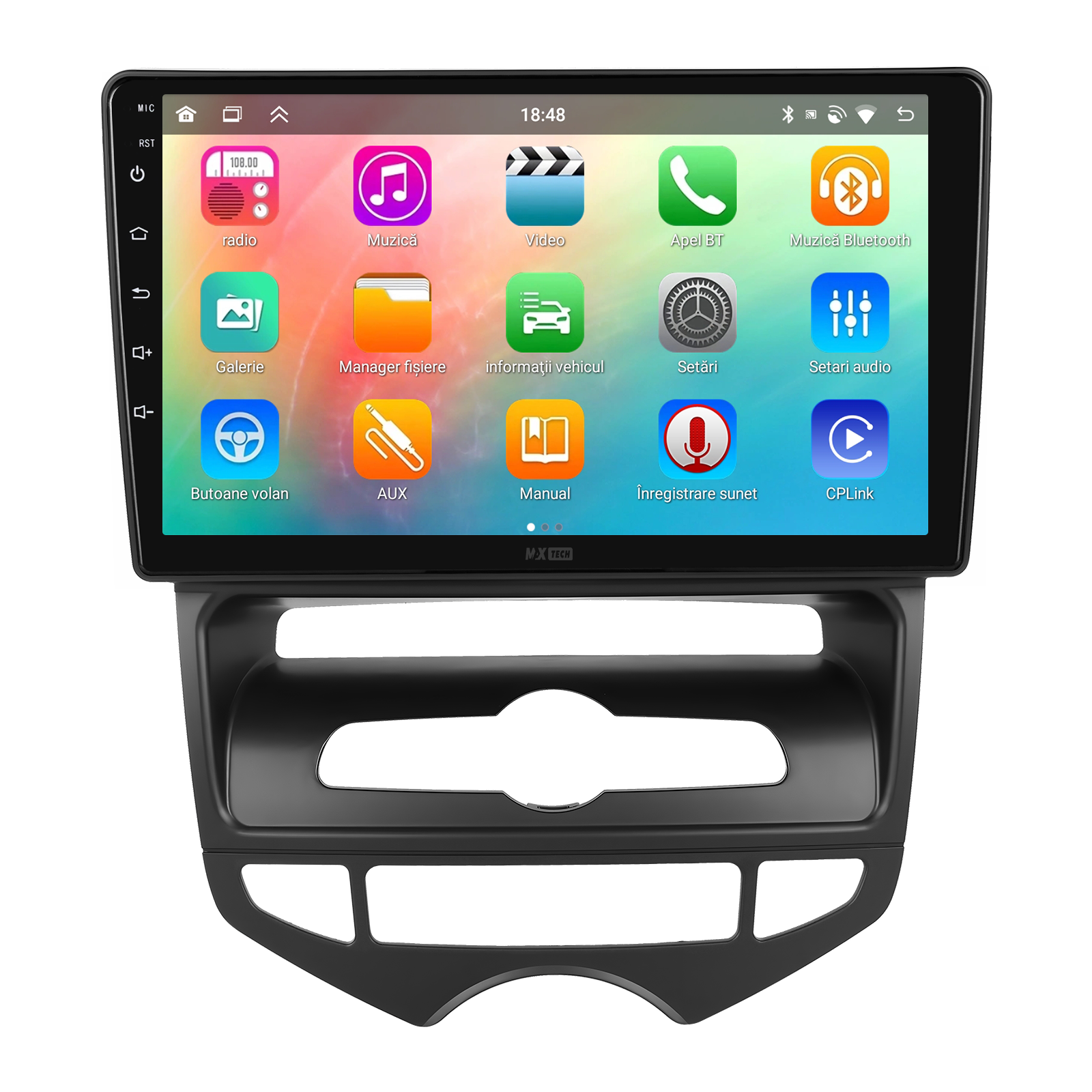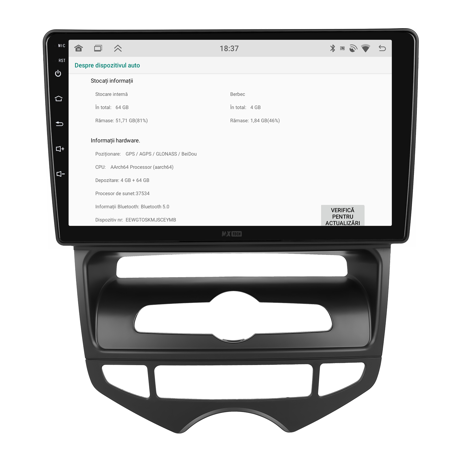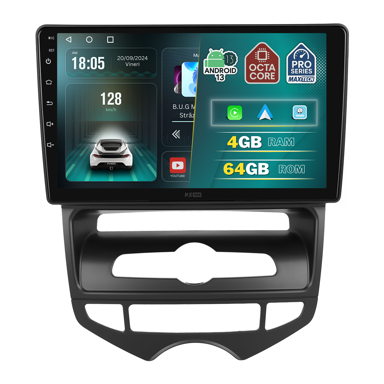 Sistemul MaxTech ProSeries este echipat cu un procesor OctaCore de tip 4+4, 4 GB RAM si 64 GB stocare, pentru multitasking rapid. Ecranul IPS HD de 1280×720 ofera culori reale si vizibilitate excelenta din orice unghi, cu design modern 2.5D.