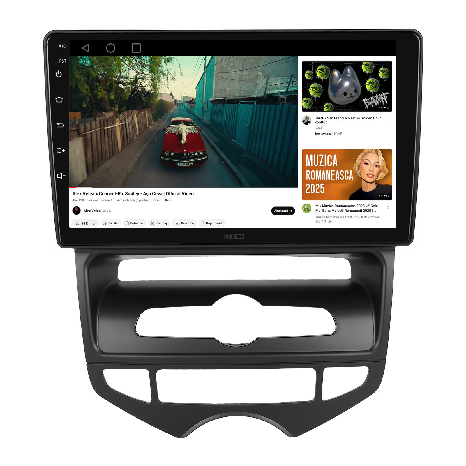 Sistemul include radio RDS cu afisare post si melodie, comutare automata pe frecventa cea mai buna si procesare audio DSP cu egalizator si filtru activ pentru sunet clar, echilibrat si personalizabil.
