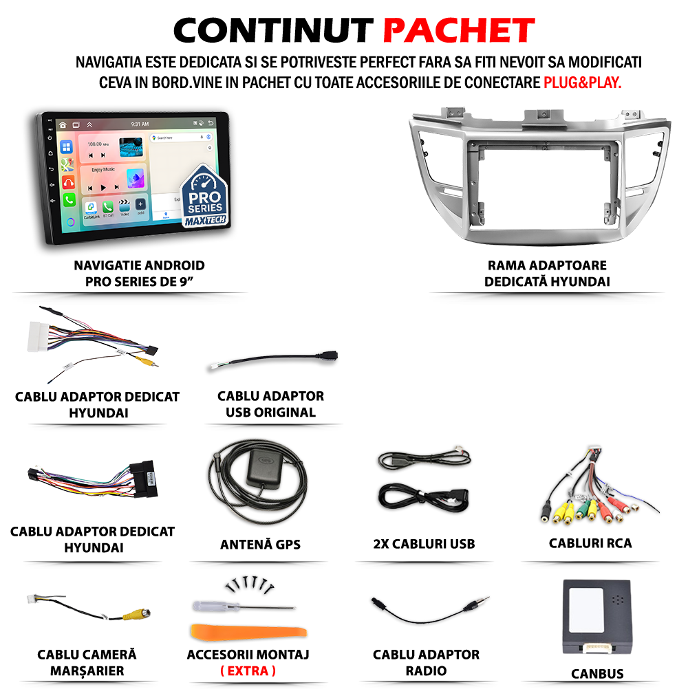 Navigatie Hyundai Tucson 2015-2017 dedicata, MaxTech® PRO SERIES, 6 GB Ram 128 GB Rom OctaCore, Carplay & Android auto, Ecran 9” HD Touch, GPS, Wifi, Bluetooth, Radio, USB, EQ, DSP, Waze