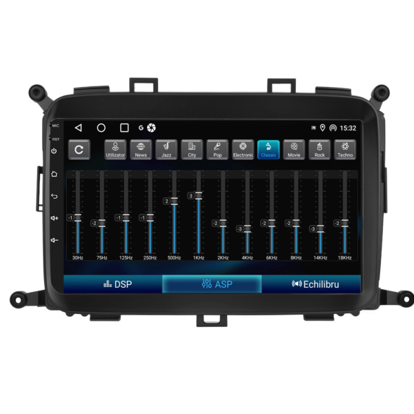 Sistemul include radio RDS cu afisare post si melodie, comutare automata pe frecventa cea mai buna si procesare audio DSP cu egalizator si filtru activ pentru sunet clar, echilibrat si personalizabil.