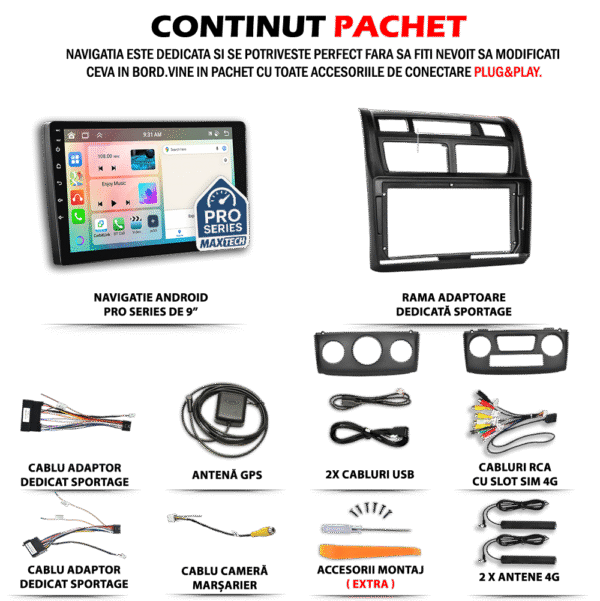 Navigatie KIA Sportage 2007-2013 dedicata, MaxTech® PRO SERIES, 8 GB Ram 128 GB Rom OctaCore, Carplay & Android auto, Ecran 9” HD Touch, SIM 4G, GPS, Wifi, Bluetooth, Radio, EQ, Waze, Youtube