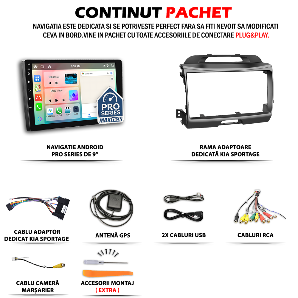 Navigatie Kia Sportage 3 (2010-2016) dedicata, MaxTech® PRO SERIES, 2 GB Ram 32 GB Rom, Carplay & Android auto, Ecran 9 ” HD Touch, GPS, Wifi, Bluetooth, Radio, USB, EQ, DSP, Waze, Youtube