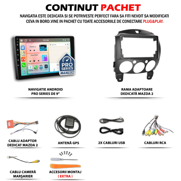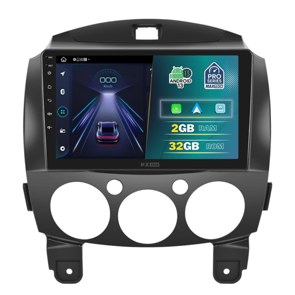 Navigatie Mazda 2 (2007-2014) dedicata, MaxTech® PRO SERIES, 2 GB Ram 32 GB Rom, Carplay & Android auto, Ecran 9 ” HD Touch, GPS, Wifi, Bluetooth, Radio, USB, EQ, DSP, Waze, Youtube