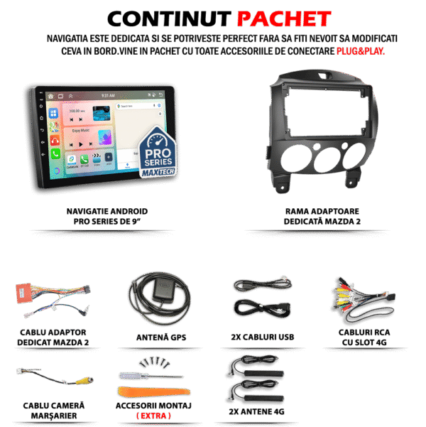 Navigatie Mazda 2 (2007-2014) dedicata, MaxTech® PRO SERIES, 8 GB Ram 128 GB Rom OctaCore, Carplay & Android auto, Ecran 9” HD Touch, SIM 4G, GPS, Wifi, Bluetooth, Radio, EQ, Waze, Youtube