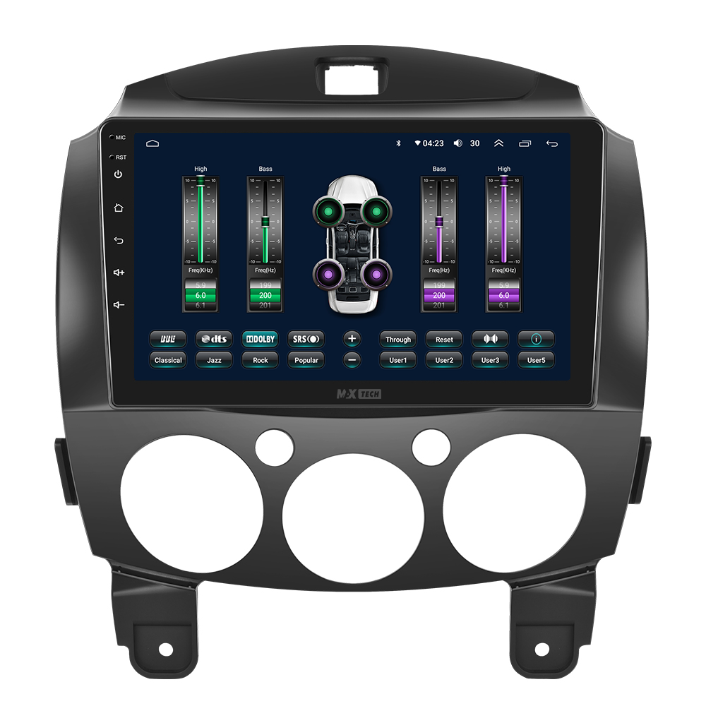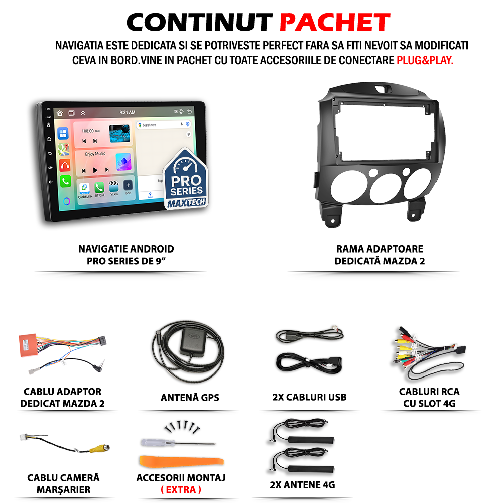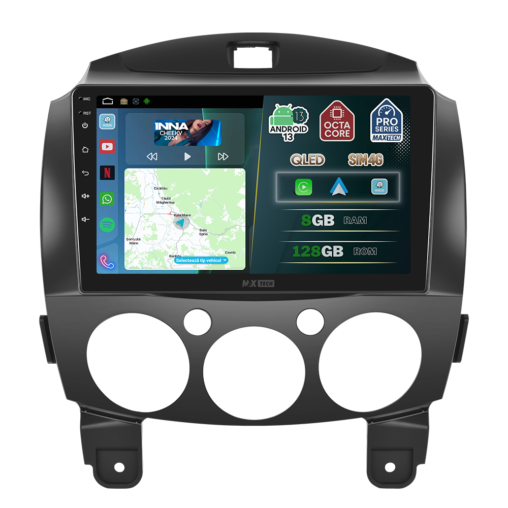 Navigatie Mazda 2 (2007-2014) dedicata, MaxTech® PRO SERIES, 8 GB Ram 128 GB Rom OctaCore, Carplay & Android auto, Ecran 9” HD Touch, SIM 4G, GPS, Wifi, Bluetooth, Radio, EQ, Waze, Youtube