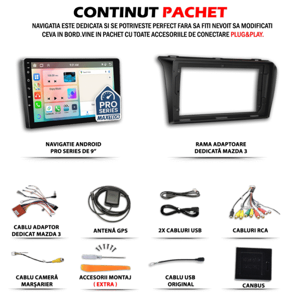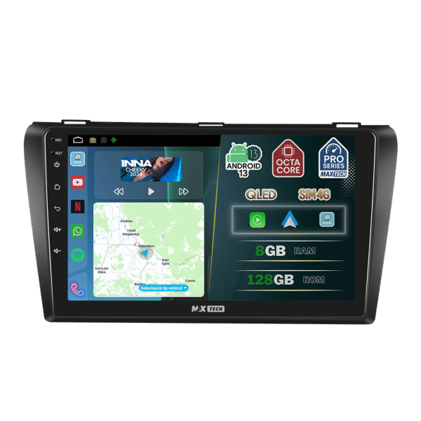 Navigatie Mazda 3 2006-2012 dedicata, MaxTech® PRO SERIES, 8 GB Ram 128 GB Rom OctaCore, Carplay & Android auto, Ecran 9” HD Touch, SIM 4G, GPS, Wifi, Bluetooth, Radio, USB, EQ, Waze, Youtube