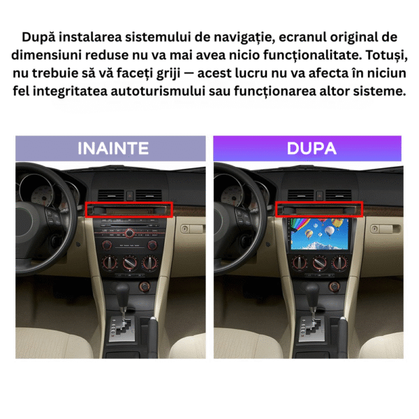 - Sistemul poate fi instalat de catre cumparator, datorita designului de tip „Plug & Play”, iar acest lucru nu afecteaza in niciun fel garantia produsului. Totusi, pentru o integrare optima cu echipamentele originale ale vehiculului, se recomanda montajul realizat de personal calificat — intr-un service auto specializat sau de catre un electrician auto cu experienta in echipamente multimedia.