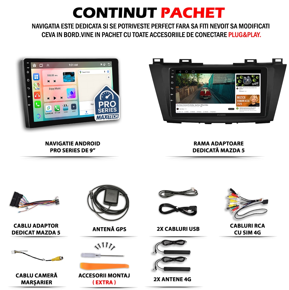 Navigatie Mazda 5 2011-2015 dedicata, MaxTech® PRO SERIES, 8 GB Ram 128 GB Rom OctaCore, Carplay & Android auto, Ecran 9” HD Touch, SIM 4G, GPS, Wifi, Bluetooth, Radio, EQ, Waze, Youtube