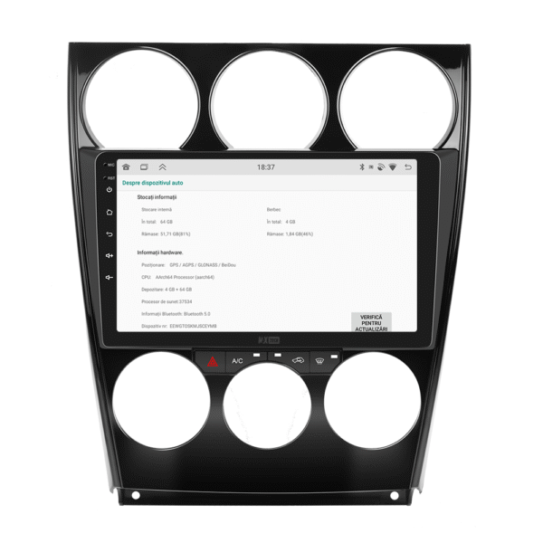 Sistemul include radio RDS cu afisare post si melodie, comutare automata pe frecventa cea mai buna si procesare audio DSP cu egalizator si filtru activ pentru sunet clar, echilibrat si personalizabil.