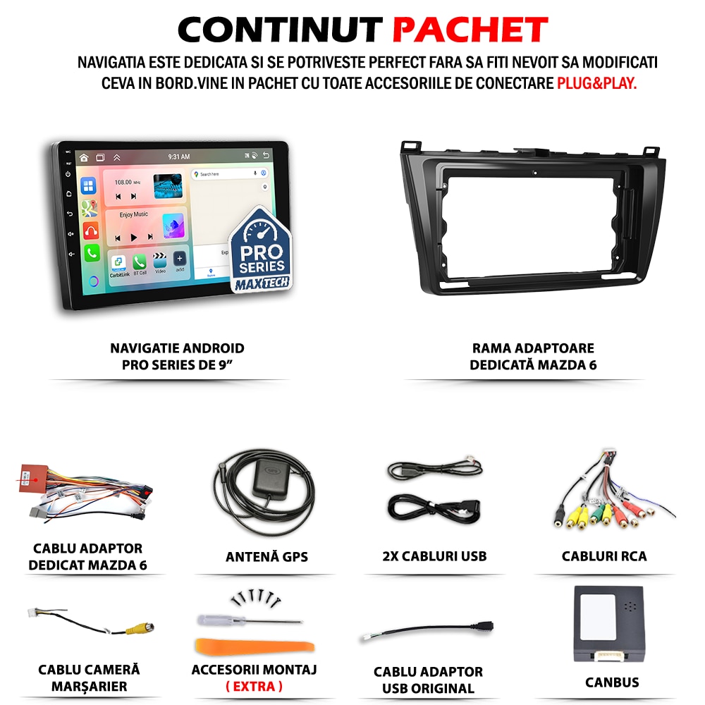 Navigatie Mazda 6 2008-2013 dedicata, MaxTech® PRO SERIES, 2 GB Ram 32 GB Rom, Carplay & Android auto, Ecran 9 ” HD Touch, GPS, Wifi, Bluetooth, Radio, USB, EQ, DSP, Waze, Youtube