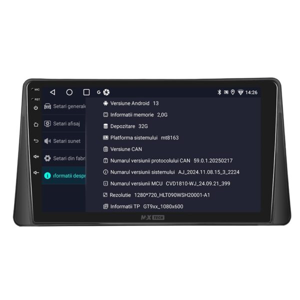 Sistemul include radio RDS cu afisare post si melodie, comutare automata pe frecventa cea mai buna si procesare audio DSP cu egalizator si filtru activ pentru sunet clar, echilibrat si personalizabil.