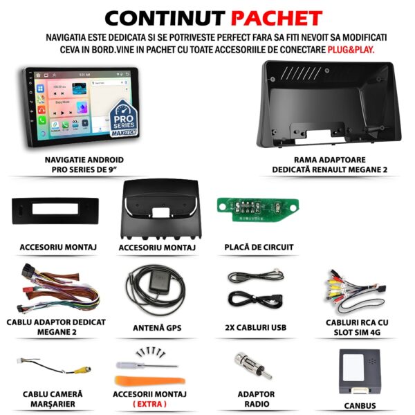 - Inainte de montaj, este esential ca toate componentele incluse in pachet sa fie verificate cu atentie. Conectorii trebuie sa corespunda cu cei ai vehiculului, iar eventualele module CANBUS, adaptoarele pentru comenzile de pe volan sau extensiile auxiliare (USB, RCA etc.) trebuie instalate conform specificatiilor tehnice.