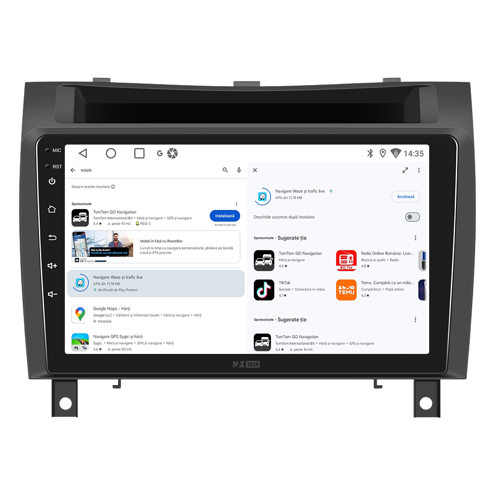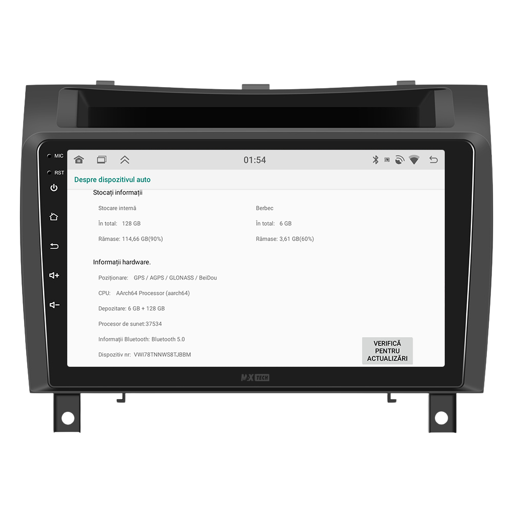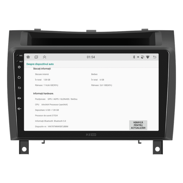 Sistemul MaxTech Pro Series este echipat cu un procesor OctaCore de tip 4+4, 6 GB RAM si 128 GB stocare, pentru multitasking rapid. Ecranul IPS HD de 1280×720 ofera culori reale si vizibilitate excelenta din orice unghi, cu design modern 2.5D.