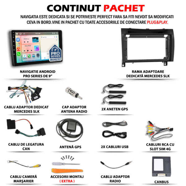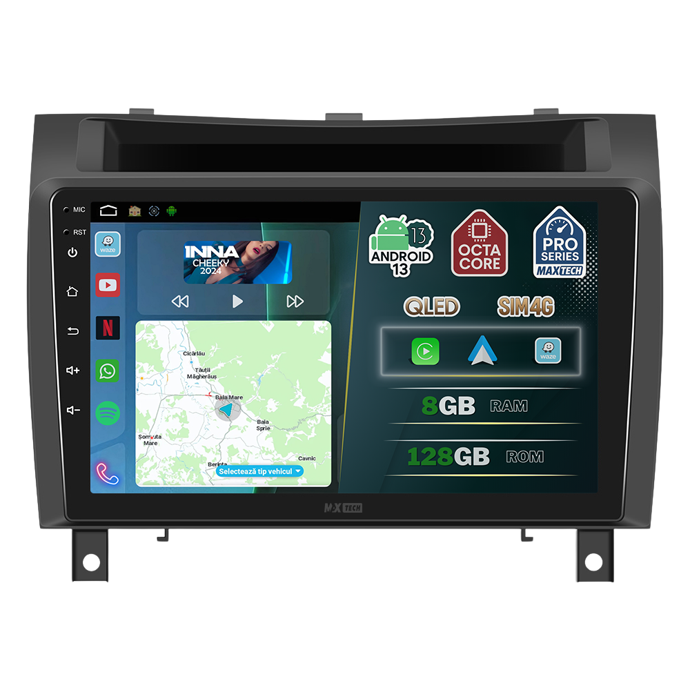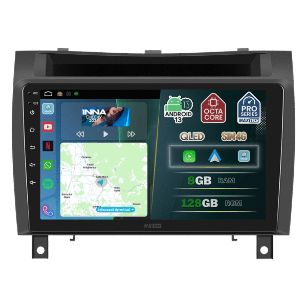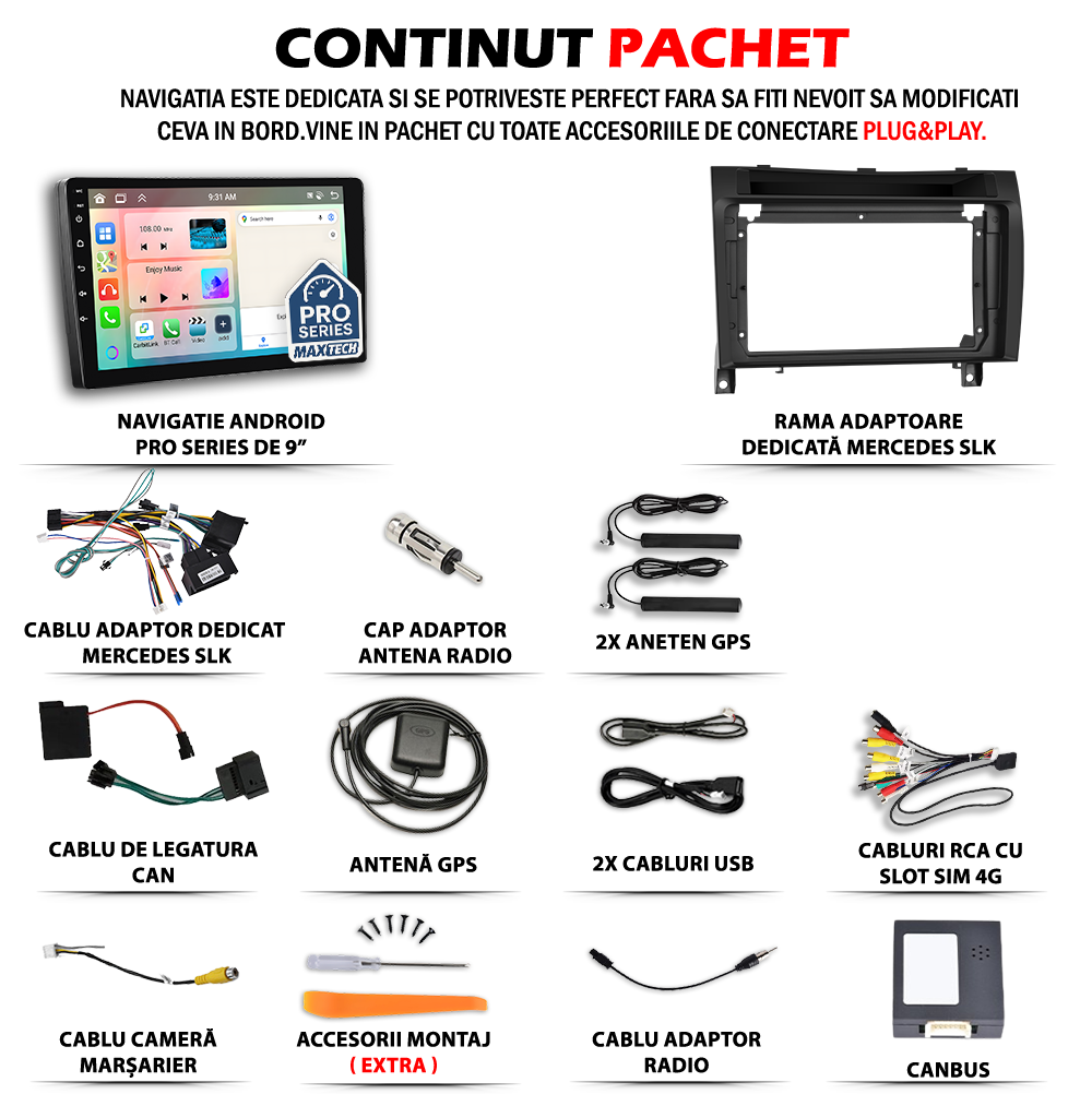 Navigatie Mercedes Benz SLK 2008–2011 dedicata, MaxTech® PRO SERIES, 8 GB Ram 128 GB Rom OctaCore, Carplay & Android auto, Ecran 9” HD Touch, SIM 4G, GPS, Wifi, Bluetooth, Radio, EQ, Waze, Youtube