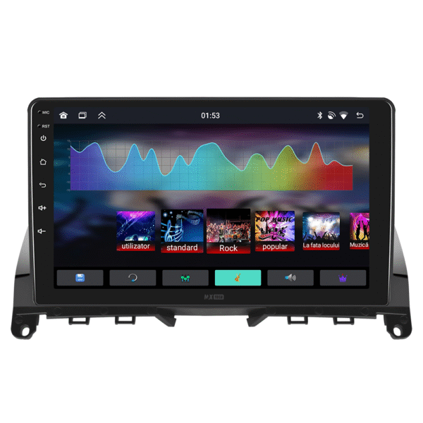 Sistemul include radio RDS cu afisare post si melodie, comutare automata pe frecventa cea mai buna si procesare audio DSP cu egalizator si filtru activ pentru sunet clar, echilibrat si personalizabil.