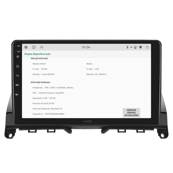 Sistemul MaxTech Pro Series este echipat cu un procesor OctaCore de tip 4+4, 6 GB RAM si 128 GB stocare, pentru multitasking rapid. Ecranul IPS HD de 1280×720 ofera culori reale si vizibilitate excelenta din orice unghi, cu design modern 2.5D.