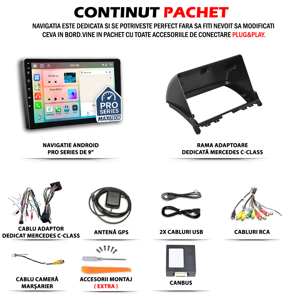 Navigatie Mercedes C-CLASS W204/S204 pre-facelift (2007–2011) dedicata, MaxTech® PRO SERIES, 6 GB Ram 128 GB Rom OctaCore, Carplay & Android auto, Ecran 9” HD Touch, GPS, Wifi, Bluetooth, Radio