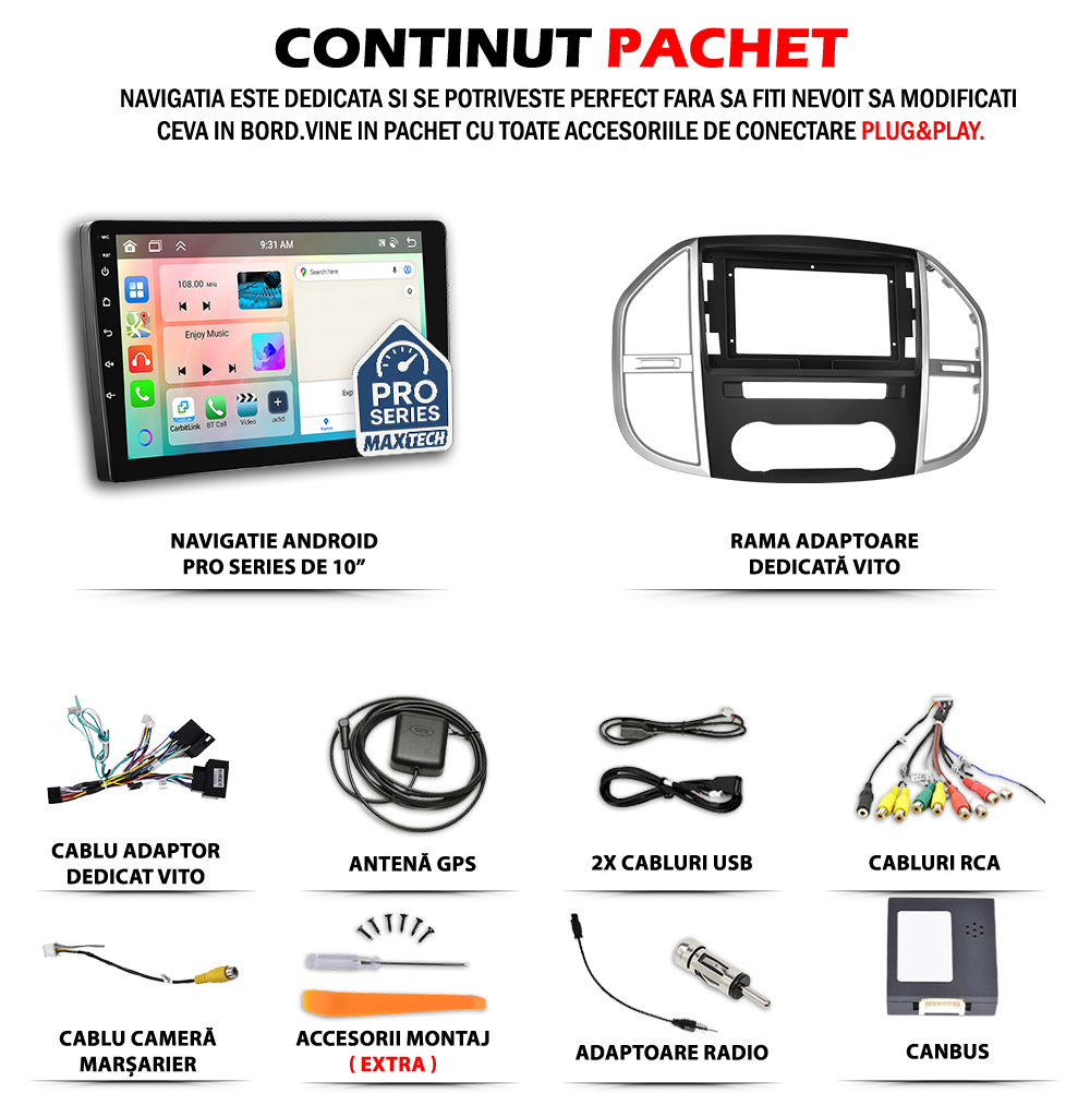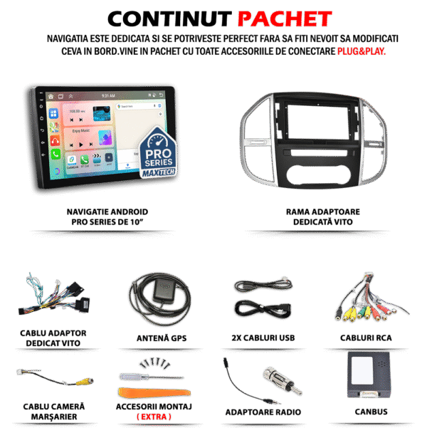 Navigatie Mercedes Vito W447 (2014-2020) dedicata, MaxTech® PRO SERIES, 4 GB Ram 64 GB Rom OctaCore, Carplay & Android auto, Ecran 10 ” HD Touch, GPS, Wifi, Bluetooth, Radio, USB, EQ, Waze