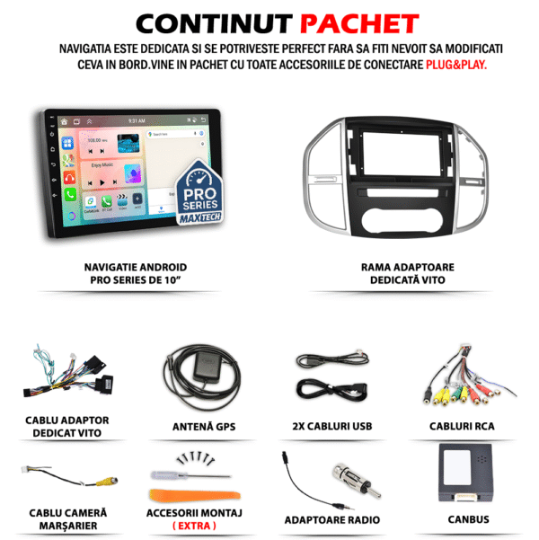 Navigatie Mercedes Vito W447 (2014-2020) dedicata, MaxTech® PRO SERIES, 6 GB Ram 128 GB Rom OctaCore, Carplay & Android auto, Ecran 10” HD Touch, GPS, Wifi, Bluetooth, Radio, USB, EQ, Waze