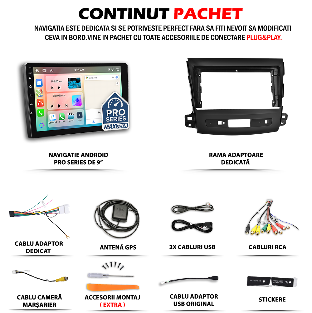 Navigatie Mitsubishi Outlander (2006–2012), Citroen C-Crosser si Peugeot 4007 (2007–2012) dedicata, MaxTech® PRO SERIES, 2 GB Ram 32 GB Rom, Carplay & Android auto, Ecran 9 ” HD Touch, GPS, Waze