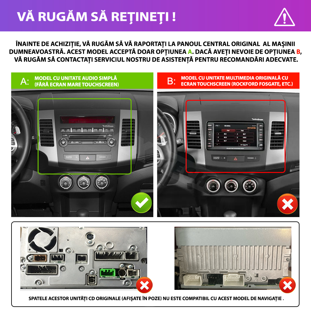 - Desi aceste sisteme sunt concepute pentru instalare de tip „Plug & Play”, in cazuri exceptionale, particularitatile specifice fiecarui model auto pot impune o atentie suplimentara in ceea ce priveste conectica si integrarea cu sistemele originale ale vehicululu . ( Daca este cazul, anumite atentionari vor fi evidentiate in imaginile produsului.)