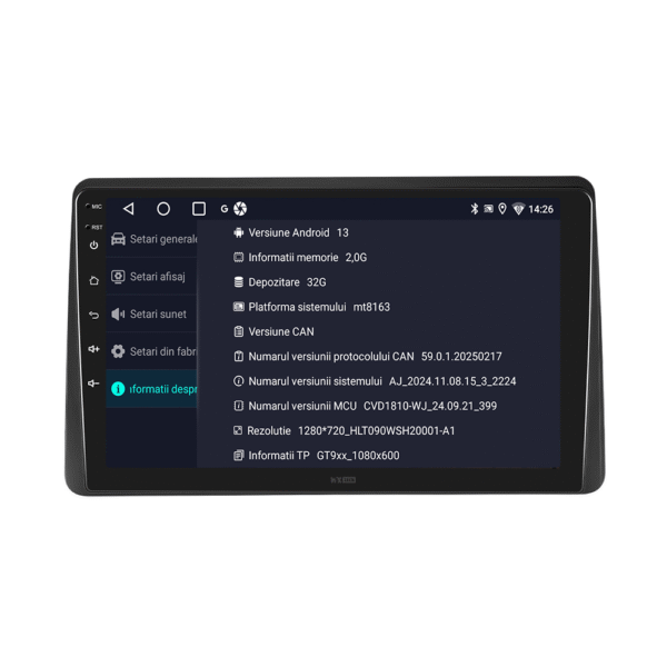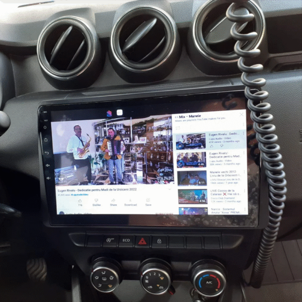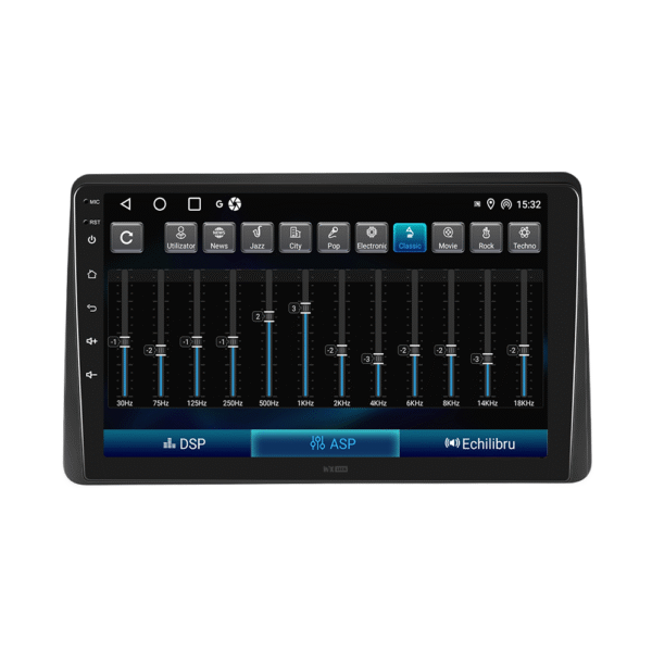 Sistemul include radio RDS cu afisare post si melodie, comutare automata pe frecventa cea mai buna si procesare audio DSP cu egalizator si filtru activ pentru sunet clar, echilibrat si personalizabil.