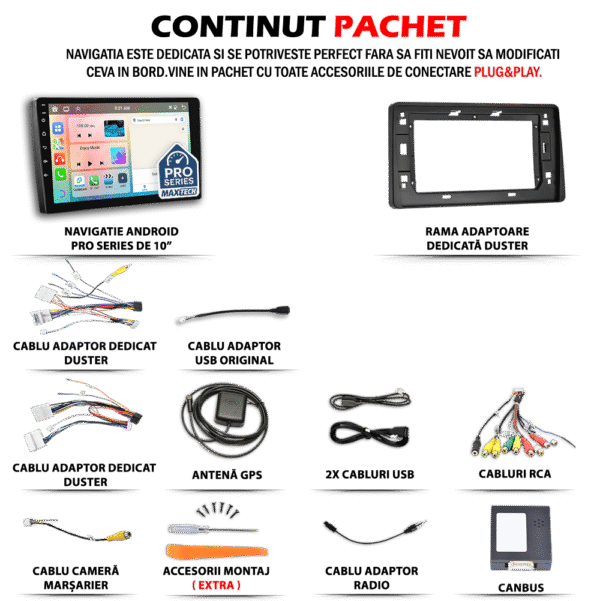 - Inainte de montaj, este esential ca toate componentele incluse in pachet sa fie verificate cu atentie. Conectorii trebuie sa corespunda cu cei ai vehiculului, iar eventualele module CANBUS, adaptoarele pentru comenzile de pe volan sau extensiile auxiliare (USB, RCA etc.) trebuie instalate conform specificatiilor tehnice.