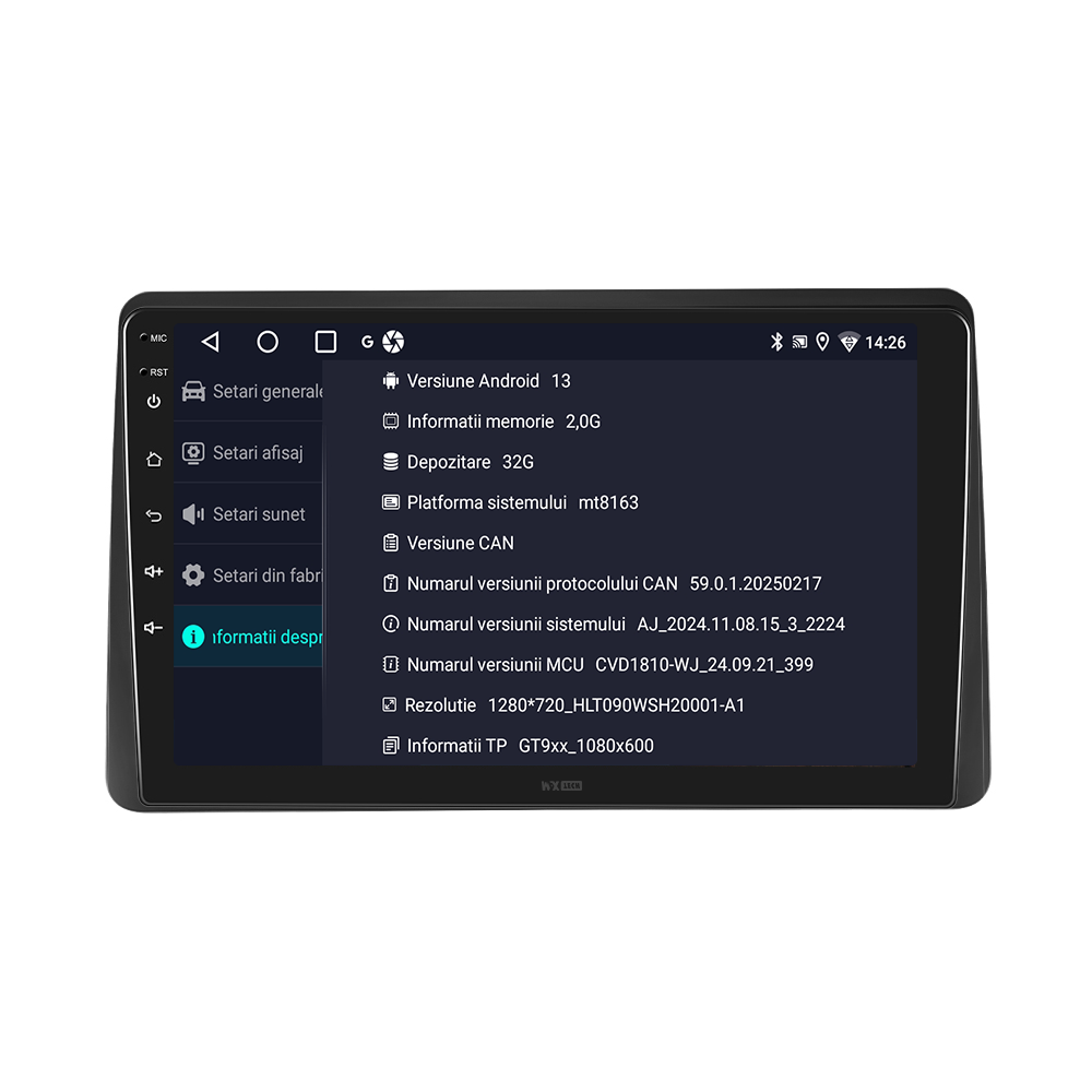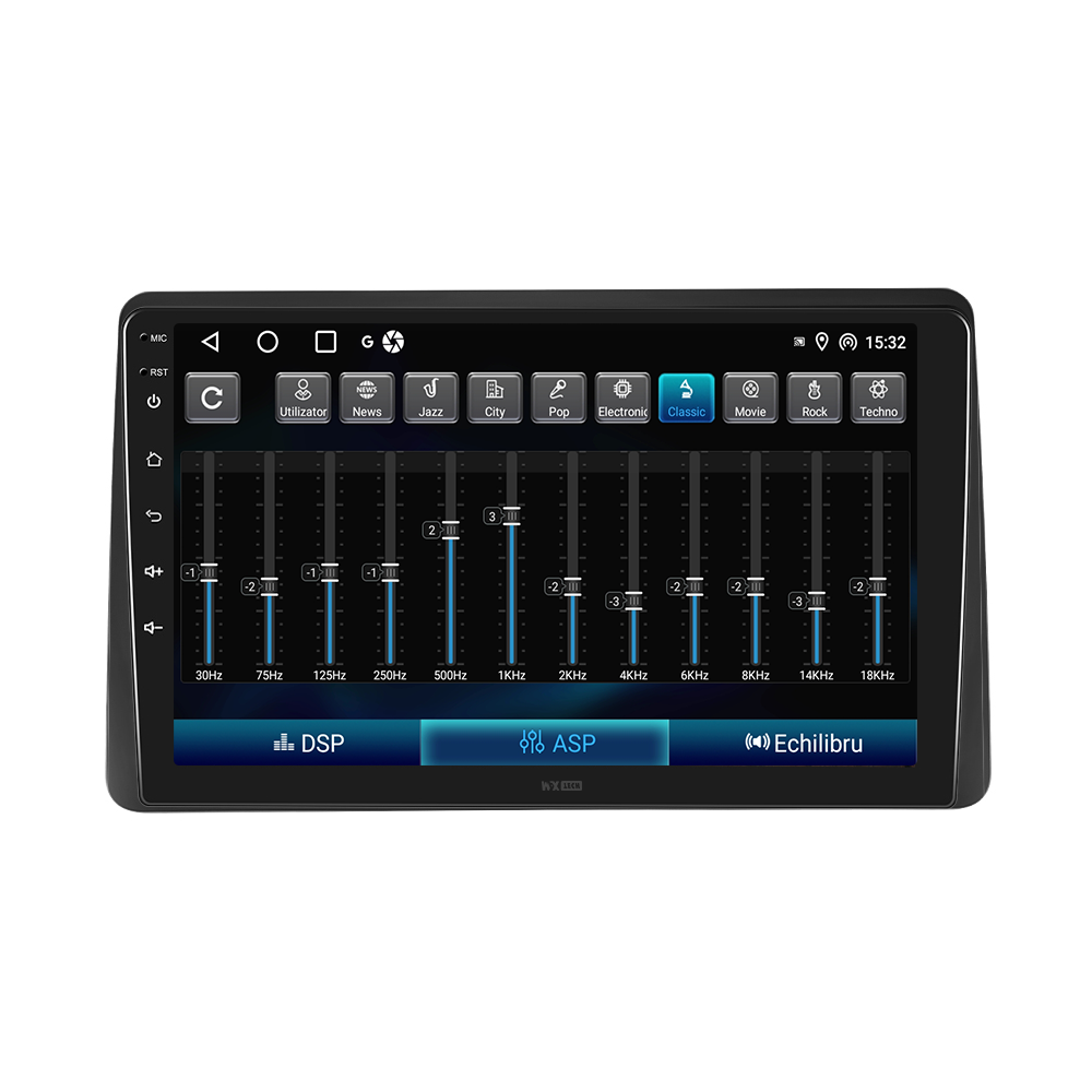 Sistemul include radio RDS cu afisare post si melodie, comutare automata pe frecventa cea mai buna si procesare audio DSP cu egalizator si filtru activ pentru sunet clar, echilibrat si personalizabil.