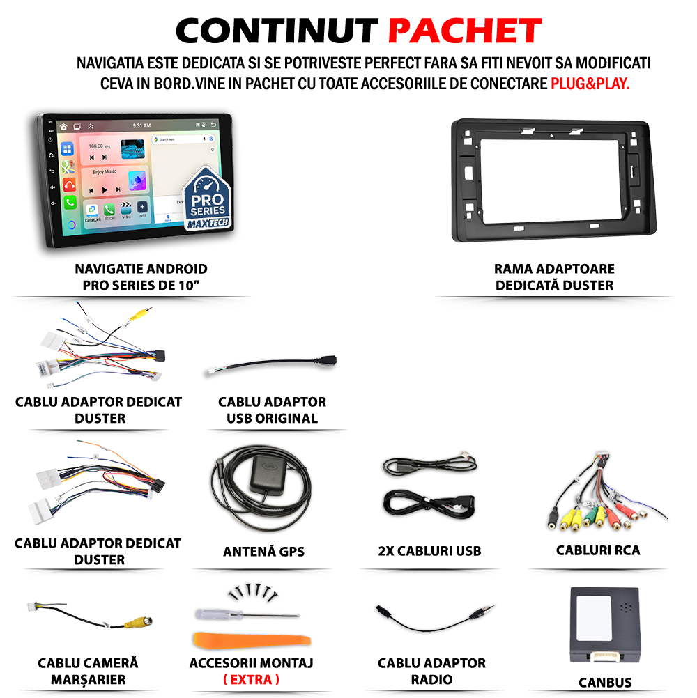 - Inainte de montaj, este esential ca toate componentele incluse in pachet sa fie verificate cu atentie. Conectorii trebuie sa corespunda cu cei ai vehiculului, iar eventualele module CANBUS, adaptoarele pentru comenzile de pe volan sau extensiile auxiliare (USB, RCA etc.) trebuie instalate conform specificatiilor tehnice.