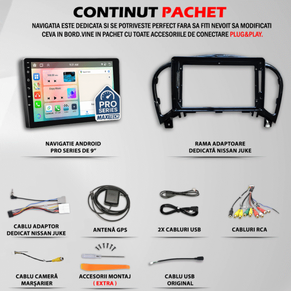 Navigatie Nissan Juke 2010-2014 dedicata, MaxTech® PRO SERIES, 2 GB Ram 32 GB Rom, Carplay & Android auto, Ecran 9 ” HD Touch, GPS, Wifi, Bluetooth, Radio, USB, EQ, DSP, Waze, Youtube, Google play
