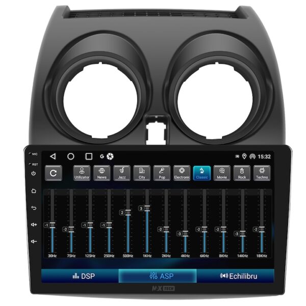 Sistemul include radio RDS cu afisare post si melodie, comutare automata pe frecventa cea mai buna si procesare audio DSP cu egalizator si filtru activ pentru sunet clar, echilibrat si personalizabil.