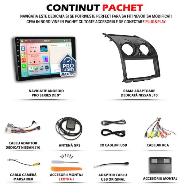 - Sistemul poate fi instalat de catre cumparator, datorita designului de tip „Plug & Play”, iar acest lucru nu afecteaza in niciun fel garantia produsului. Totusi, pentru o integrare optima cu echipamentele originale ale vehiculului, se recomanda montajul realizat de personal calificat — intr-un service auto specializat sau de catre un electrician auto cu experienta in echipamente multimedia.