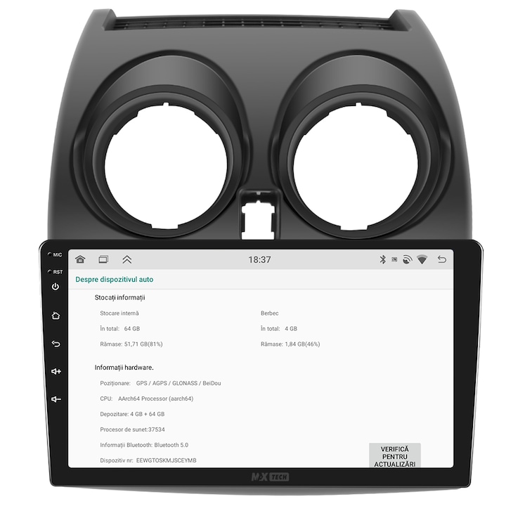 Sistemul MaxTech ProSeries este echipat cu un procesor OctaCore de tip 4+4, 4 GB RAM si 64 GB stocare, pentru multitasking rapid. Ecranul IPS HD de 1280×720 ofera culori reale si vizibilitate excelenta din orice unghi, cu design modern 2.5D.