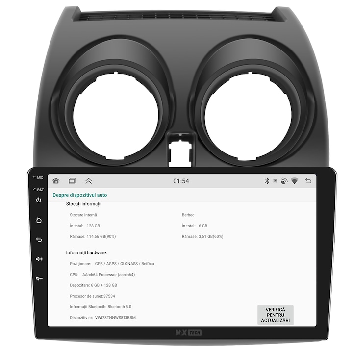 Sistemul MaxTech Pro Series este echipat cu un procesor OctaCore de tip 4+4, 6 GB RAM si 128 GB stocare, pentru multitasking rapid. Ecranul IPS HD de 1280×720 ofera culori reale si vizibilitate excelenta din orice unghi, cu design modern 2.5D.