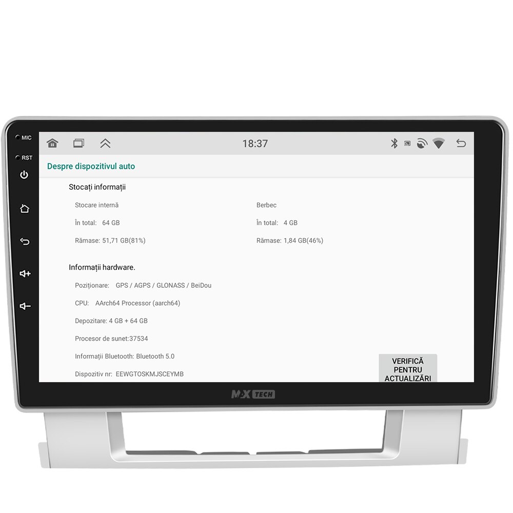 Sistemul MaxTech ProSeries este echipat cu un procesor OctaCore de tip 4+4, 4 GB RAM si 64 GB stocare, pentru multitasking rapid. Ecranul IPS HD de 1280×720 ofera culori reale si vizibilitate excelenta din orice unghi, cu design modern 2.5D.