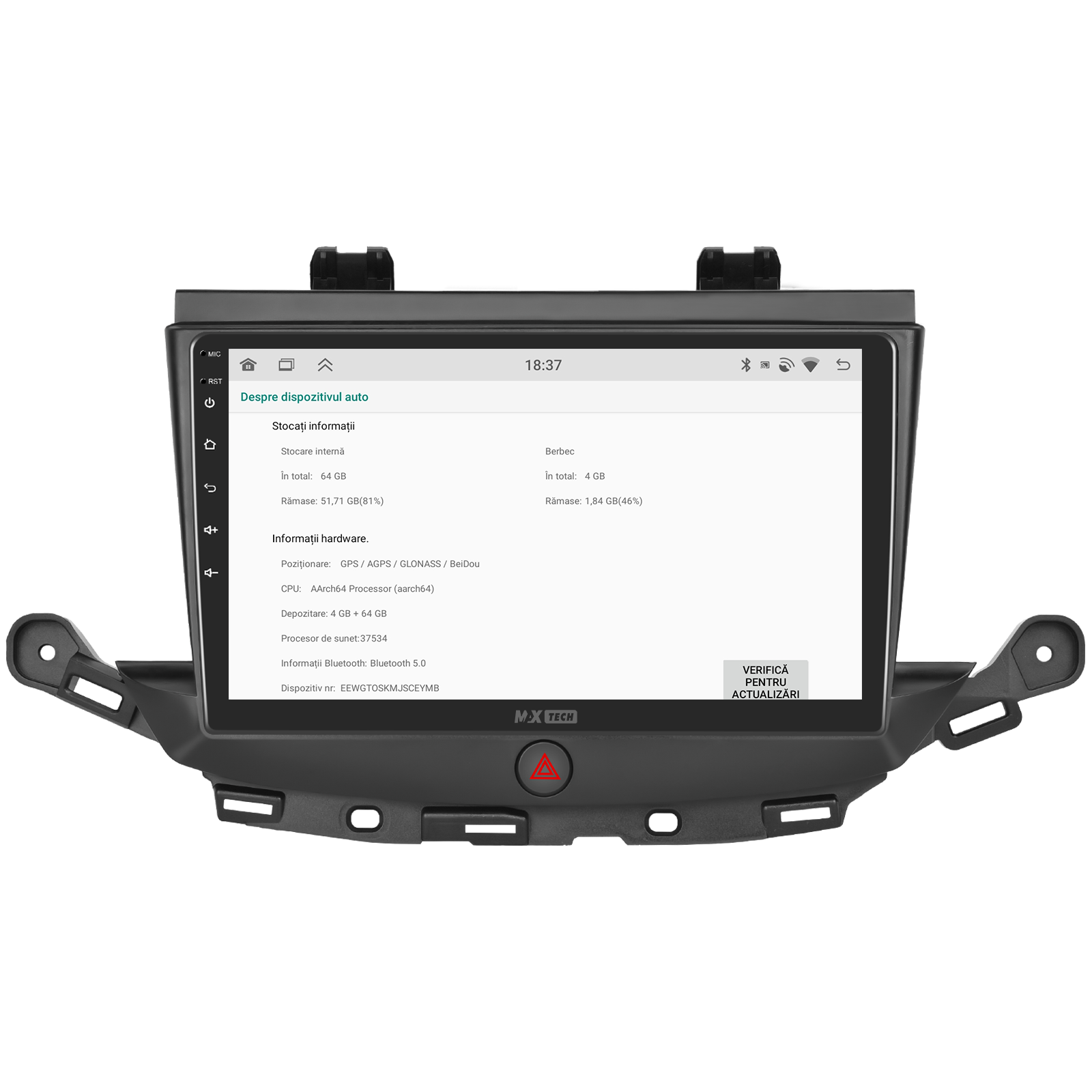 Sistemul MaxTech ProSeries este echipat cu un procesor OctaCore de tip 4+4, 4 GB RAM si 64 GB stocare, pentru multitasking rapid. Ecranul IPS HD de 1280×720 ofera culori reale si vizibilitate excelenta din orice unghi, cu design modern 2.5D.