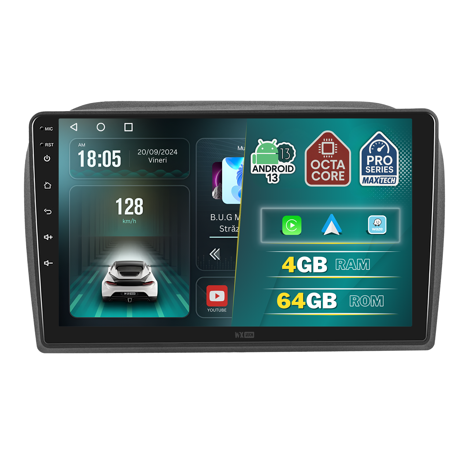 Sistemul MaxTech ProSeries este echipat cu un procesor OctaCore de tip 4+4, 4 GB RAM si 64 GB stocare, pentru multitasking rapid. Ecranul IPS HD de 1280×720 ofera culori reale si vizibilitate excelenta din orice unghi, cu design modern 2.5D.