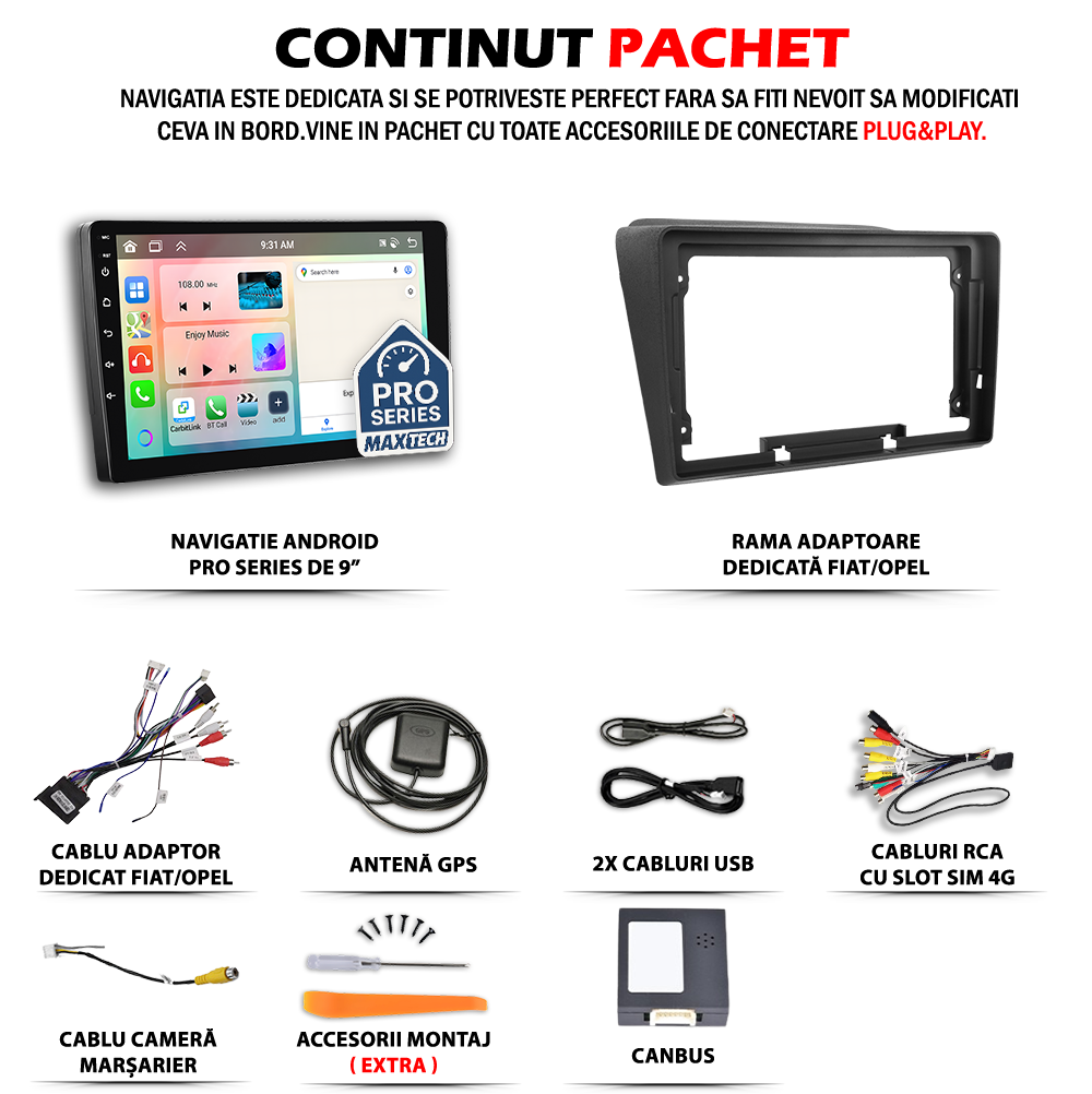 - Inainte de montaj, este esential ca toate componentele incluse in pachet sa fie verificate cu atentie. Conectorii trebuie sa corespunda cu cei ai vehiculului, iar eventualele module CANBUS, adaptoarele pentru comenzile de pe volan sau extensiile auxiliare (USB, RCA etc.) trebuie instalate conform specificatiilor tehnice.