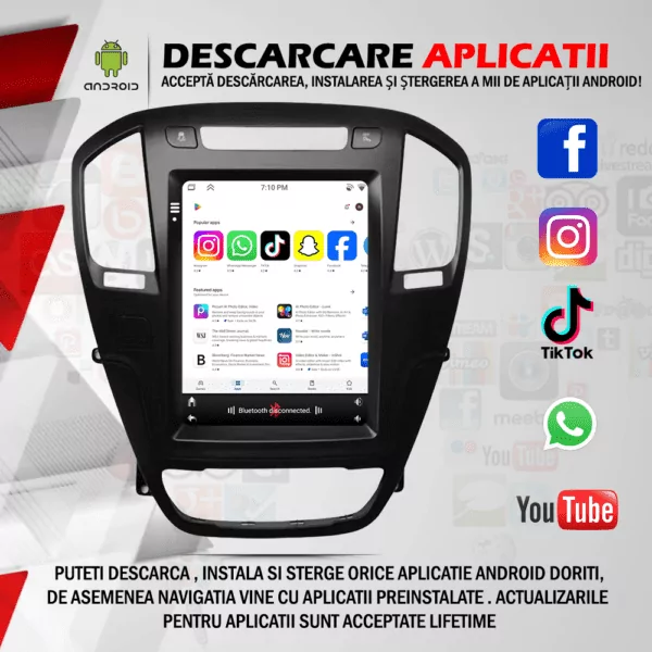 - YouTube: Acces la platforma YouTube pentru a viziona videoclipuri, muzica sau orice alt continut direct pe ecranul navigatiei.