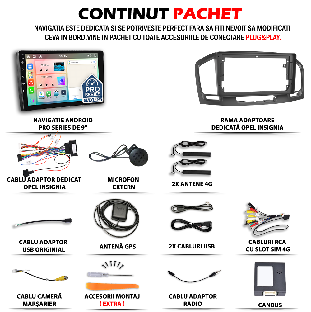 - Desi aceste sisteme sunt concepute pentru instalare de tip „Plug & Play”, in cazuri exceptionale, particularitatile specifice fiecarui model auto pot impune o atentie suplimentara in ceea ce priveste conectica si integrarea cu sistemele originale ale vehicululu . ( Daca este cazul, anumite atentionari vor fi evidentiate in imaginile produsului.)