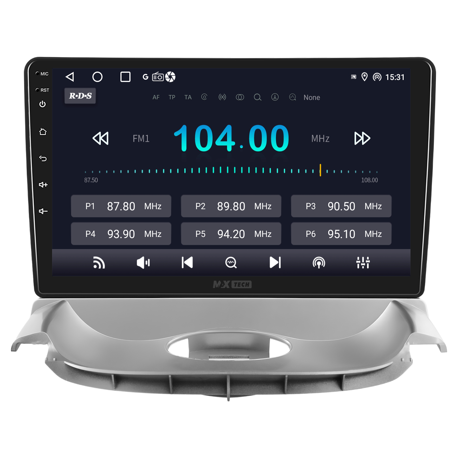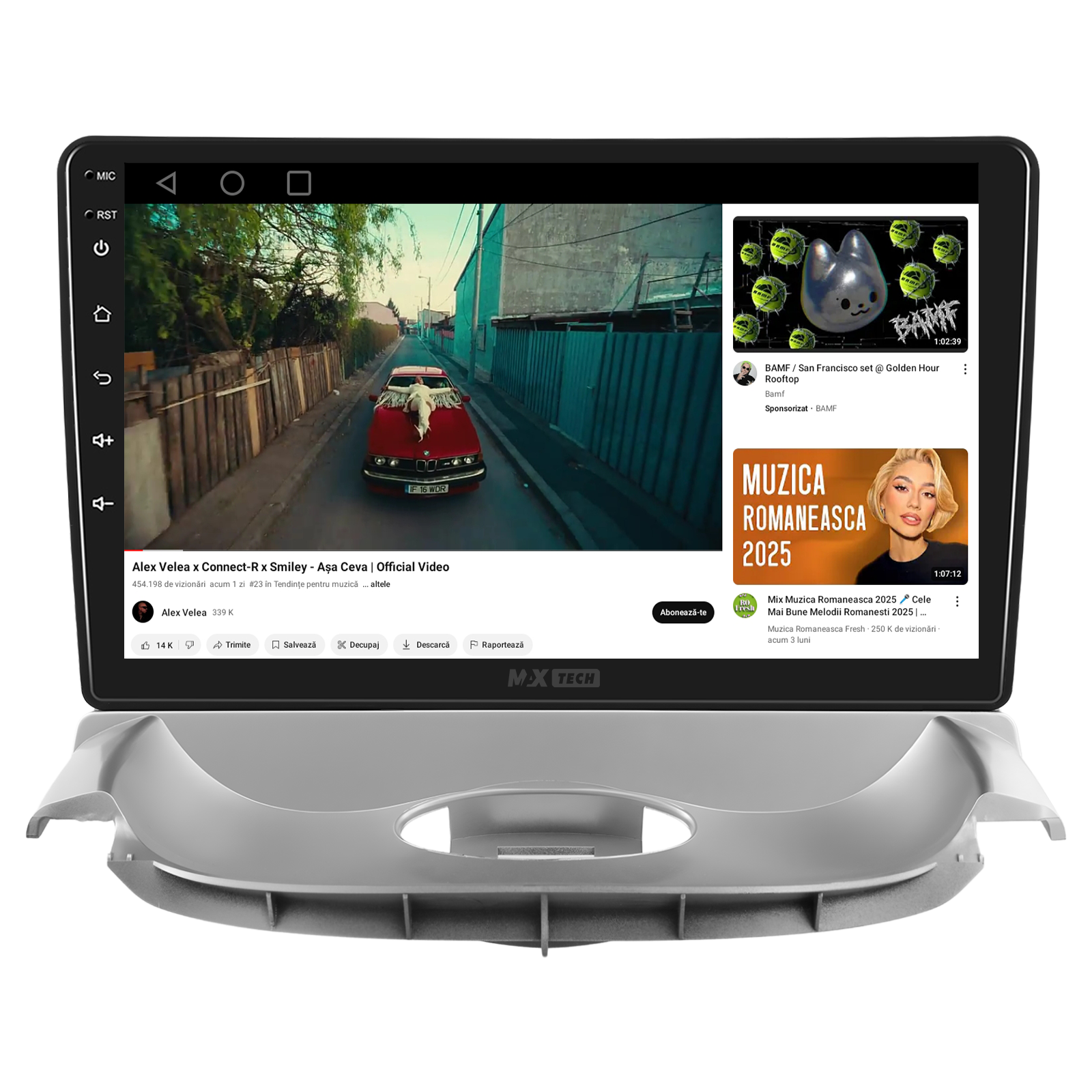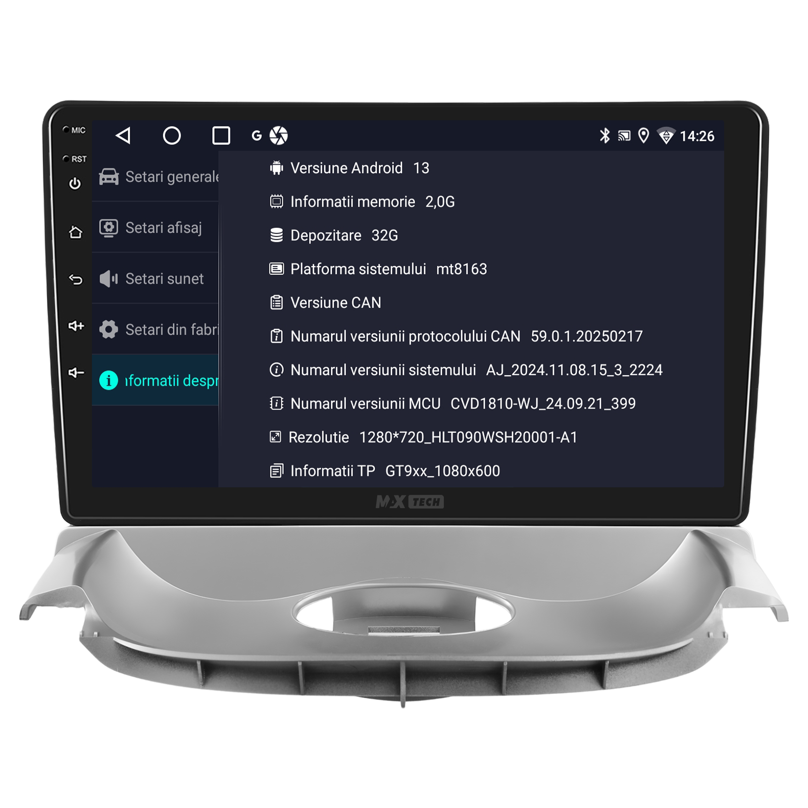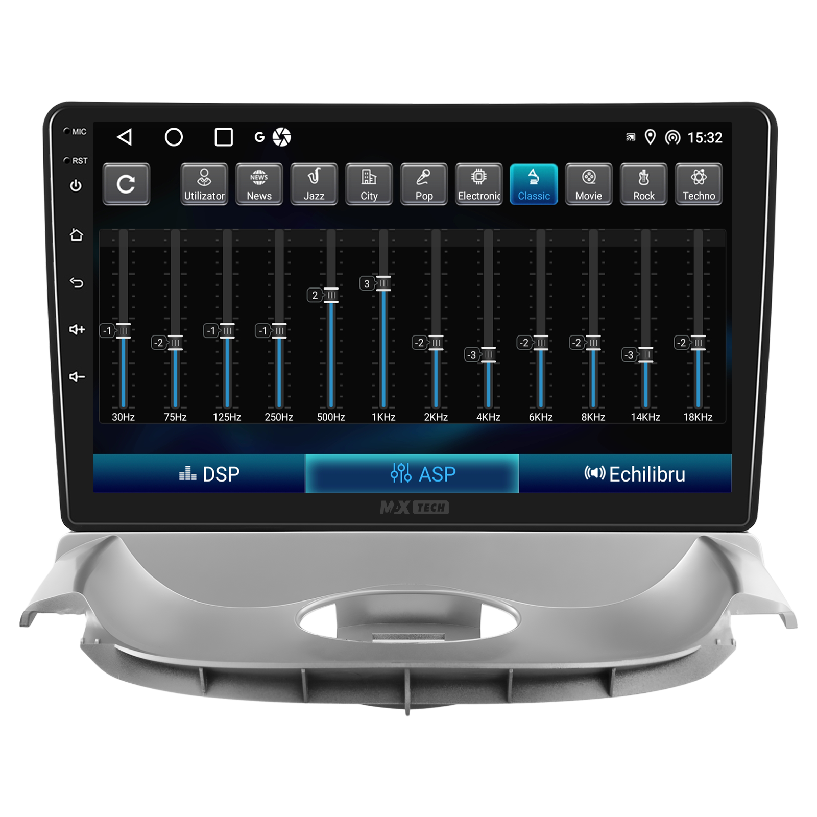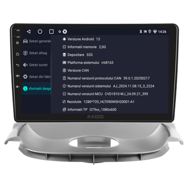 Sistemul include radio RDS cu afisare post si melodie, comutare automata pe frecventa cea mai buna si procesare audio DSP cu egalizator si filtru activ pentru sunet clar, echilibrat si personalizabil.