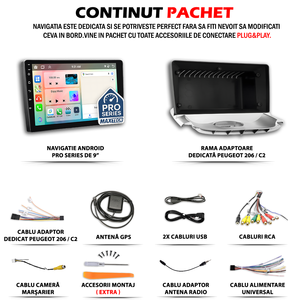 Navigatie Peugeot 206 / Citroen C2 2004-2013 dedicata, MaxTech® PRO SERIES, 2 GB Ram 32 GB Rom, Carplay & Android auto, Ecran 9 ” HD Touch, GPS, Wifi, Bluetooth, Radio, USB, EQ, DSP, Waze