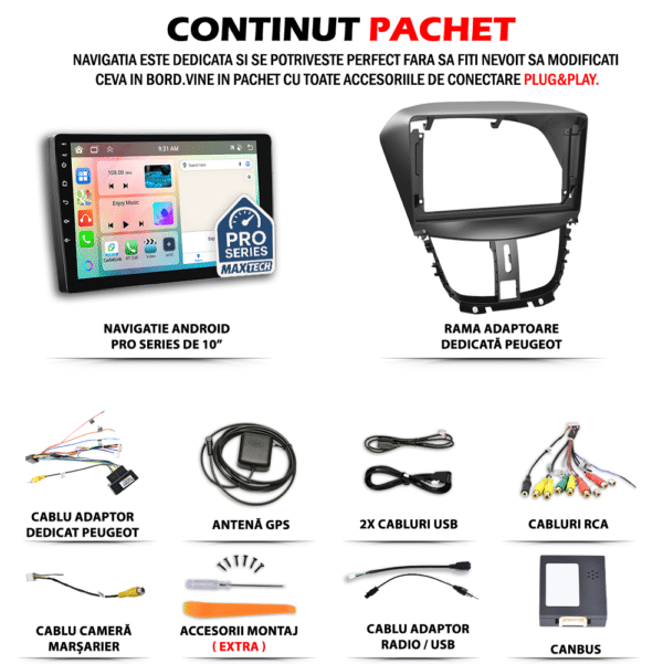 Navigatie Peugeot 207 (2009-2013) dedicata, MaxTech® PRO SERIES, 4 GB Ram 64 GB Rom OctaCore, Carplay & Android auto, Ecran 10 ” HD Touch, GPS, Wifi, Bluetooth, Radio, USB, EQ, Waze