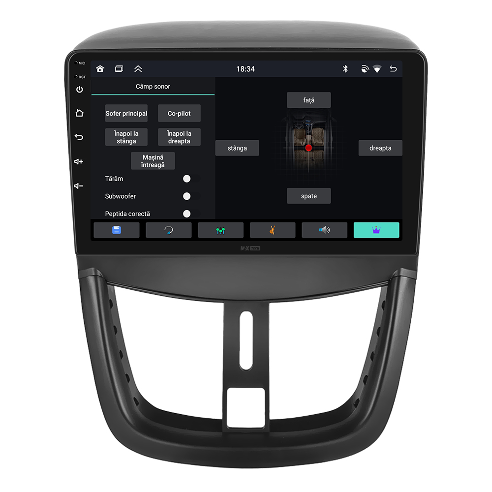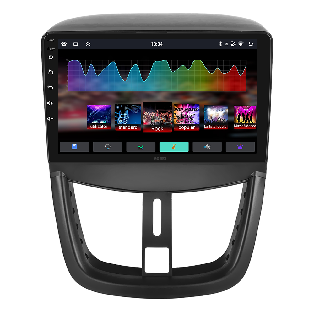 Sistemul include radio RDS cu afisare post si melodie, comutare automata pe frecventa cea mai buna si procesare audio DSP cu egalizator si filtru activ pentru sunet clar, echilibrat si personalizabil.