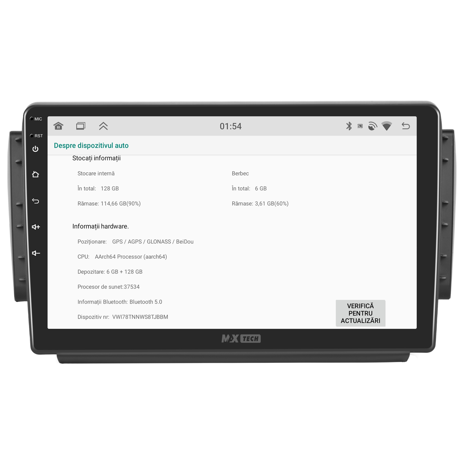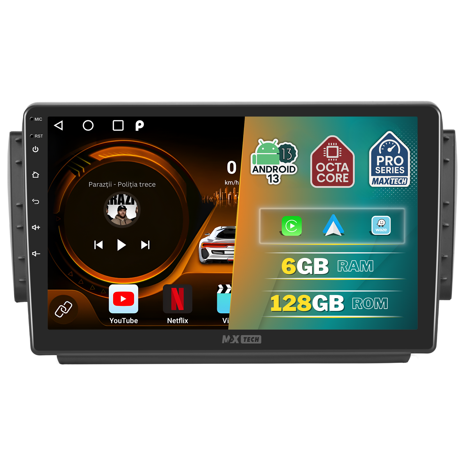 Sistemul MaxTech Pro Series este echipat cu un procesor OctaCore de tip 4+4, 6 GB RAM si 128 GB stocare, pentru multitasking rapid. Ecranul IPS HD de 1280×720 ofera culori reale si vizibilitate excelenta din orice unghi, cu design modern 2.5D.