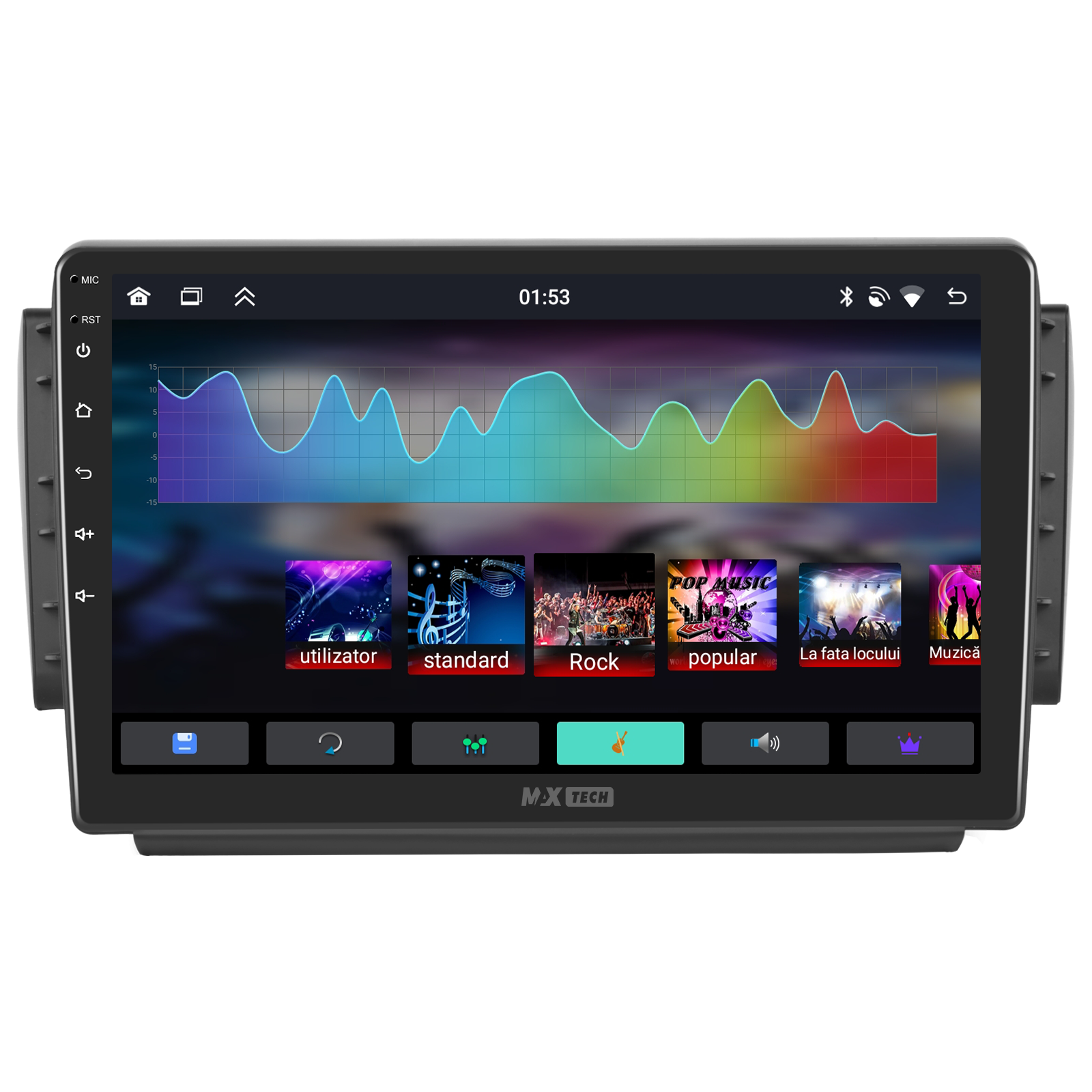 Sistemul include radio RDS cu afisare post si melodie, comutare automata pe frecventa cea mai buna si procesare audio DSP cu egalizator si filtru activ pentru sunet clar, echilibrat si personalizabil.