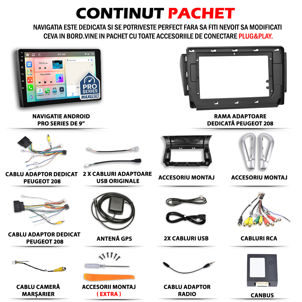 - Inainte de montaj, este esential ca toate componentele incluse in pachet sa fie verificate cu atentie. Conectorii trebuie sa corespunda cu cei ai vehiculului, iar eventualele module CANBUS, adaptoarele pentru comenzile de pe volan sau extensiile auxiliare (USB, RCA etc.) trebuie instalate conform specificatiilor tehnice.