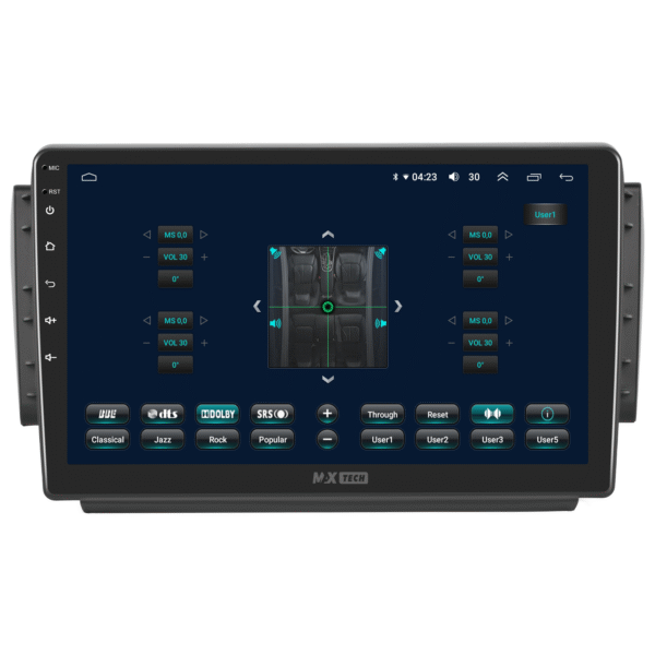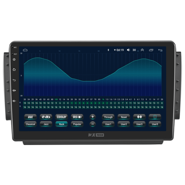Sistem audio cu suport AM/FM/RDS, transmisie muzica online prin FM. Include equalizator (EQ) pentru ajustare fina a sunetului si filtru activ (Crossover) pentru directionarea frecventelor catre difuzoare dedicate (bass, inalte etc.).